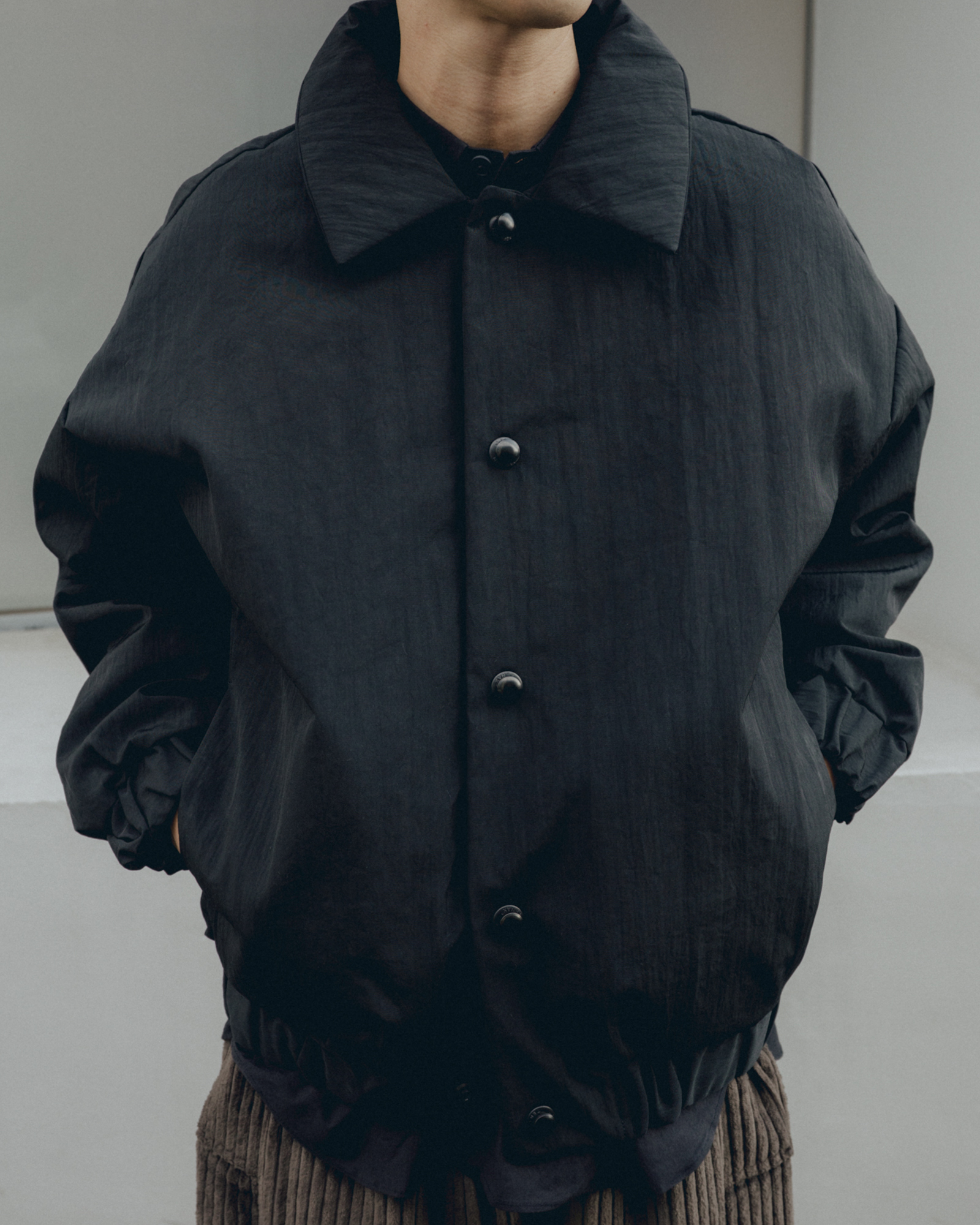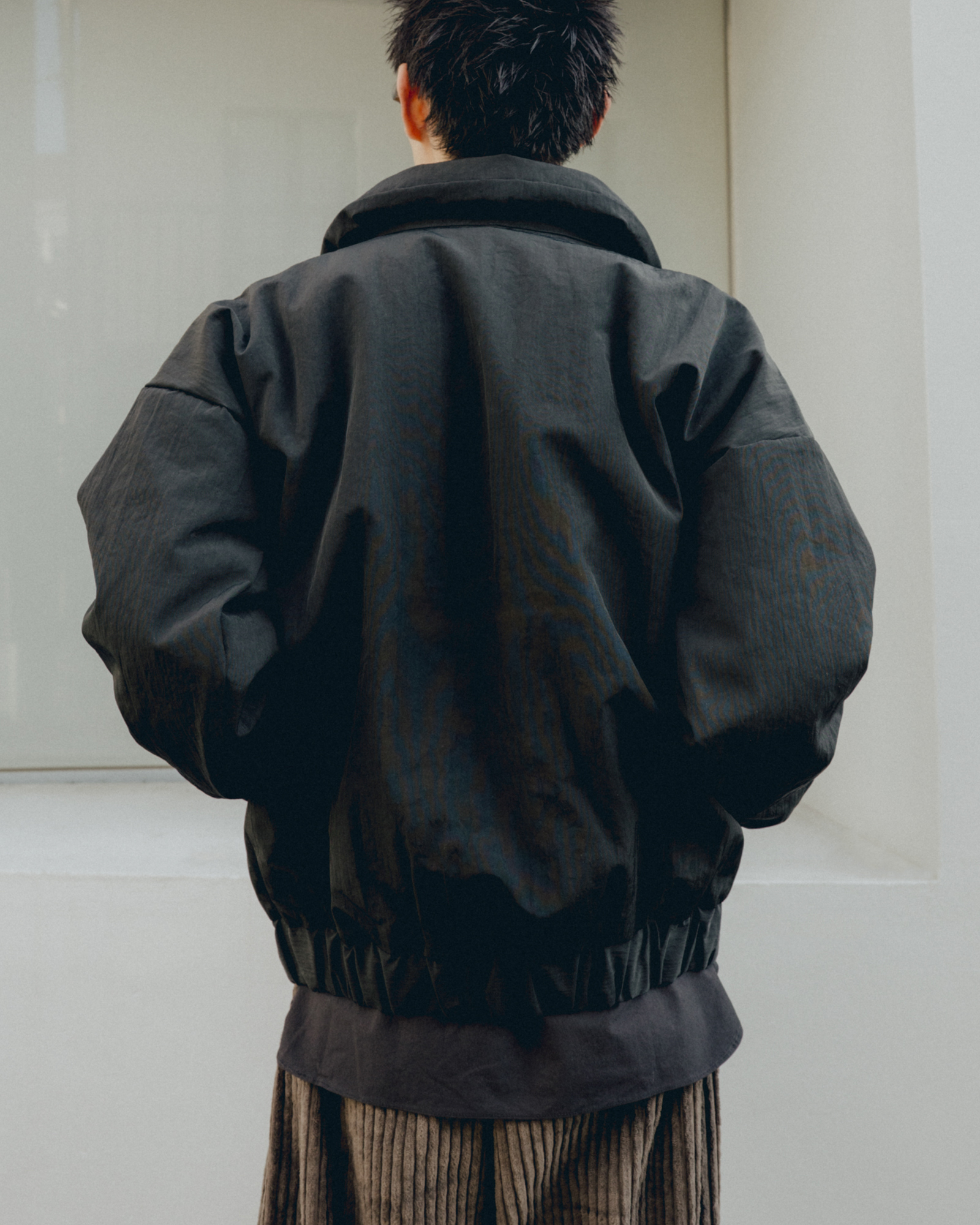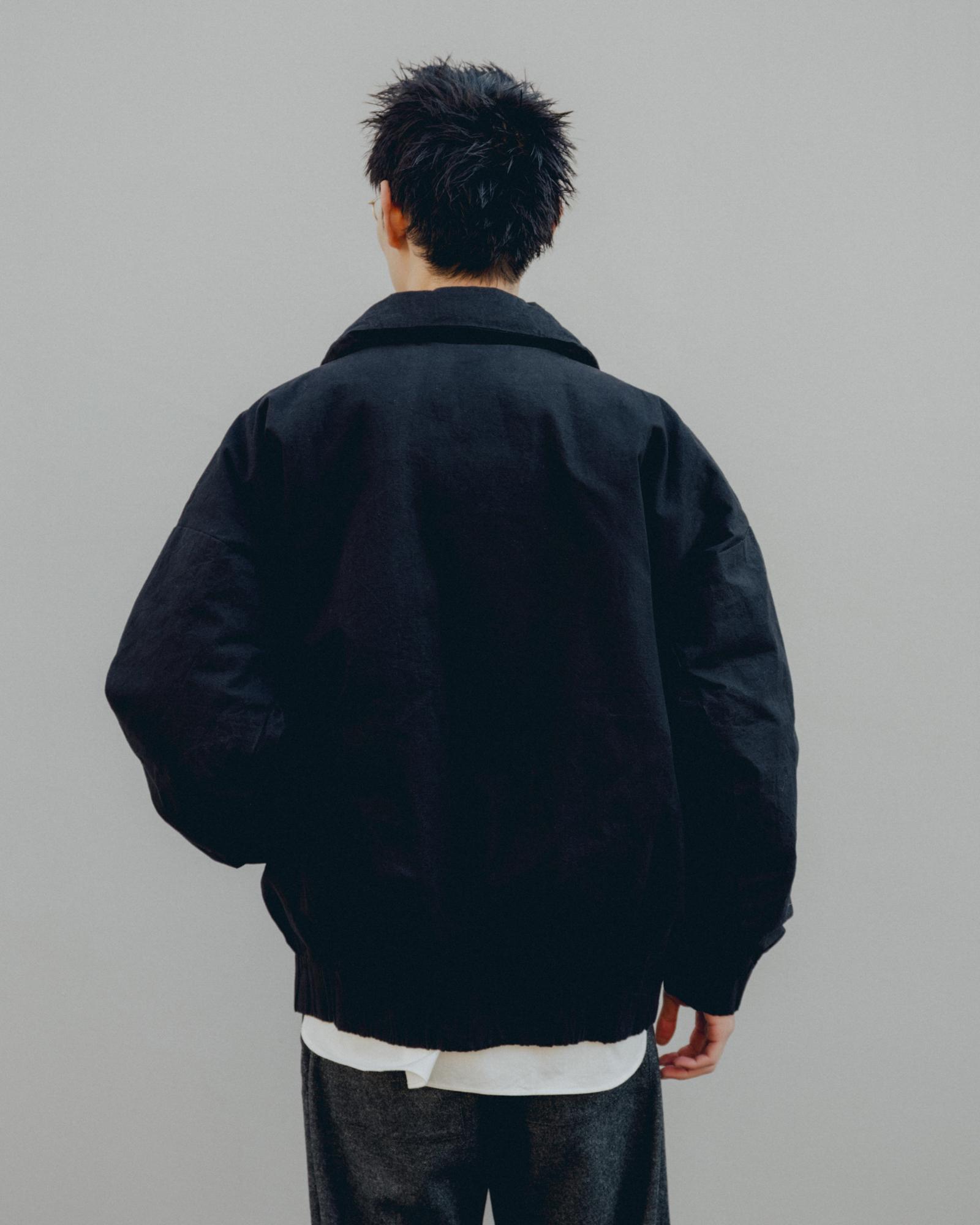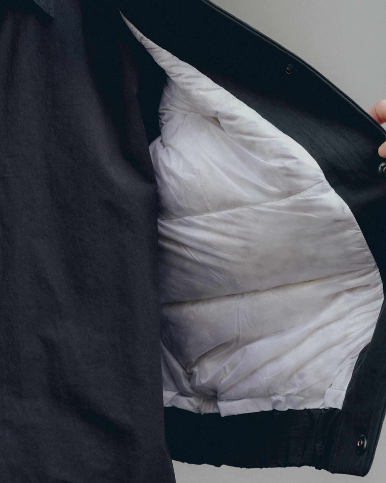 オーバーサイズシルエットのダウンブルゾン。ハンガリー産シルバーグースダウンを使用し、1891年創業の老舗羽毛専業メーカーである河田フェザー社で洗浄、加工されている。漂白剤を使用していないため、ダウン本来の斑模様が保たれている。その独特の風合いを引き立てるため、裏地には東レ開発の透明なナイロンマイクロリップストップを採用。ダウン90%・フェザー10%の比率でダマを防ぎ、超高品質に分類されるフィルパワー850を誇る。引くと外れるオリジナルのスナップ式のボタンが採用されている。通常、裏地やポケットは別生地が使用されるが、MAN-TLEの洋服はメインの生地を体感してほしいため、すべてが表地で構成される。