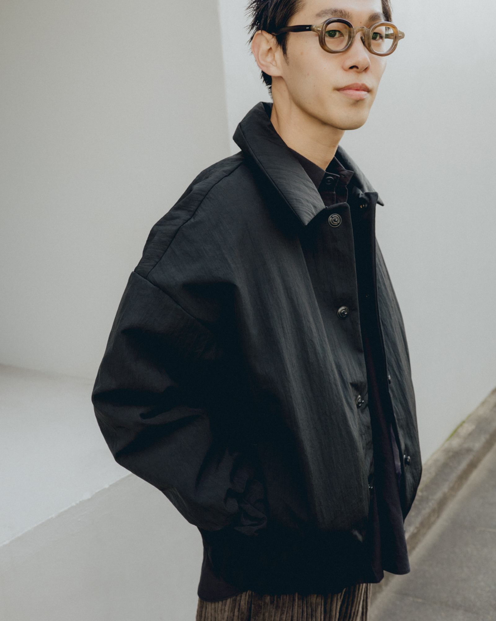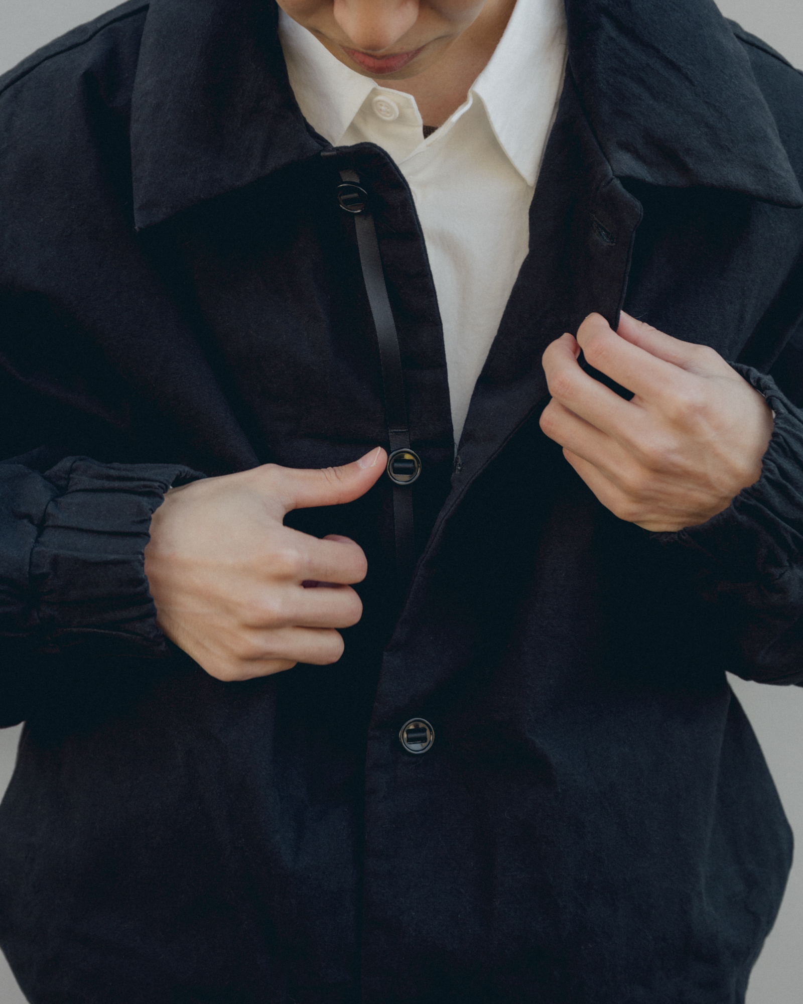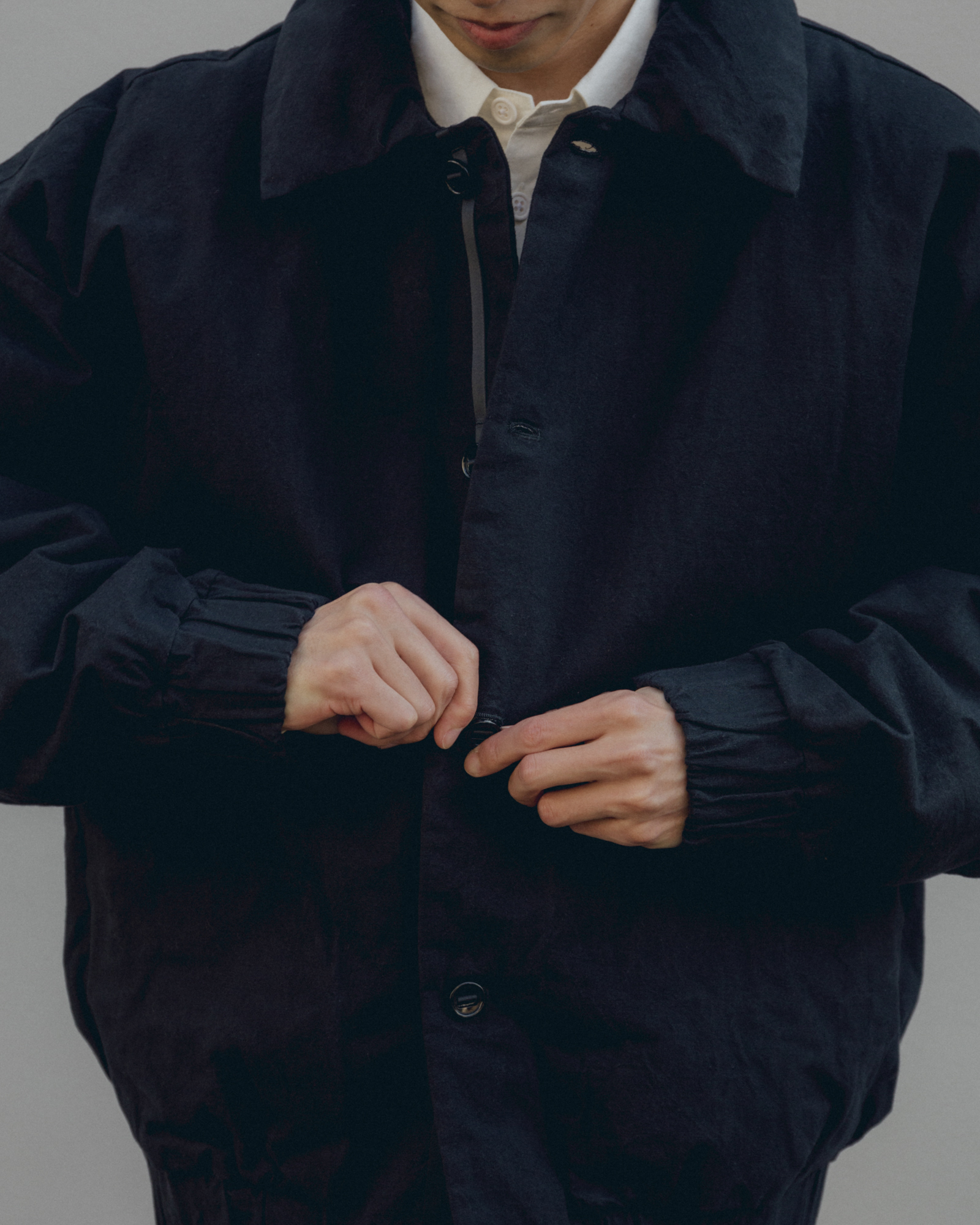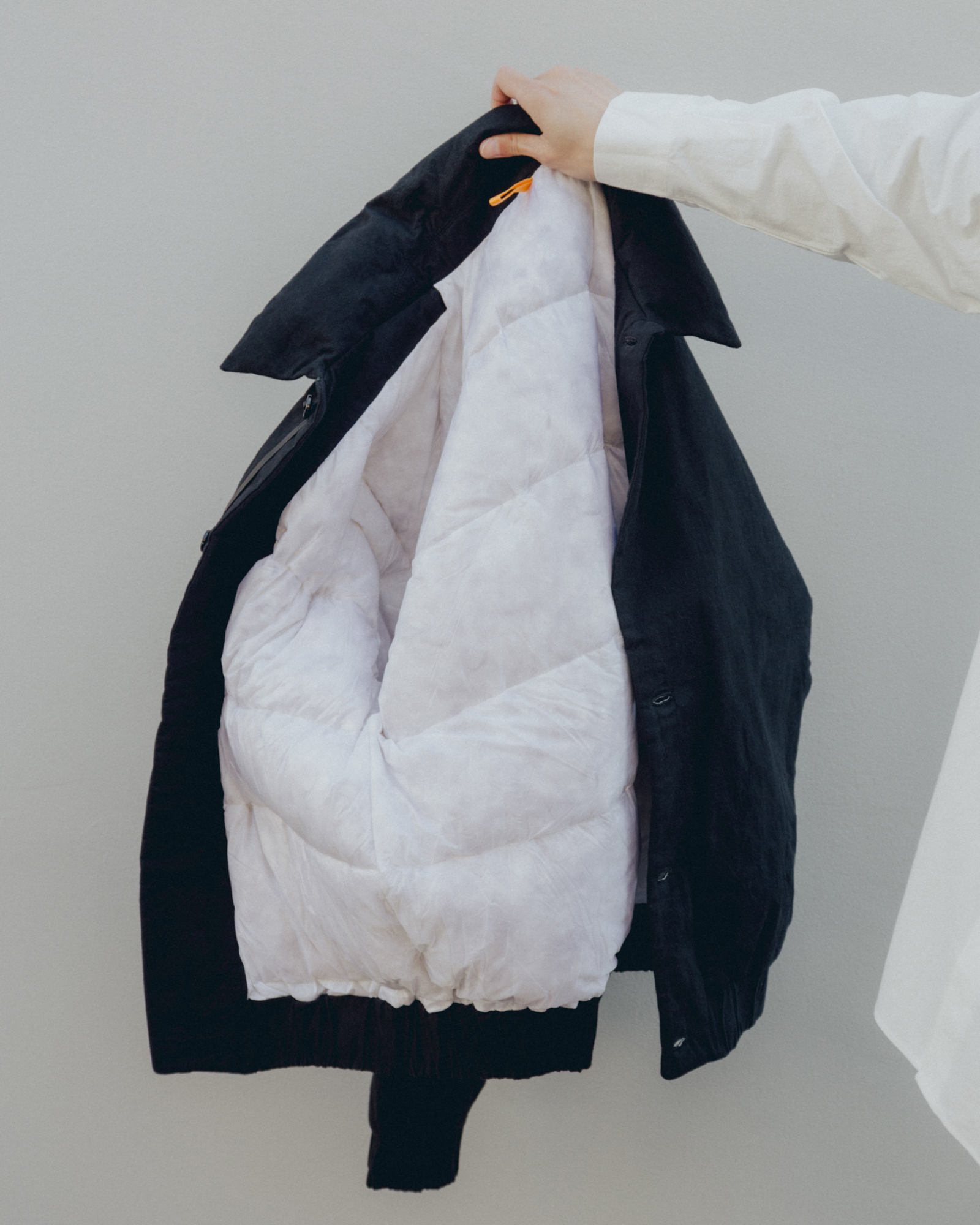 オーバーサイズシルエットのダウンブルゾン。ハンガリー産シルバーグースダウンを使用し、1891年創業の老舗羽毛専業メーカーである河田フェザー社で洗浄、加工されている。漂白剤を使用していないため、ダウン本来の斑模様が保たれている。その独特の風合いを引き立てるため、裏地には東レ開発の透明なナイロンマイクロリップストップを採用。ダウン90%・フェザー10%の比率でダマを防ぎ、超高品質に分類されるフィルパワー850を誇る。引くと外れるオリジナルのスナップ式のボタンが採用されている。通常、裏地やポケットは別生地が使用されるが、MAN-TLEの洋服はメインの生地を体感してほしいため、すべてが表地で構成される。
