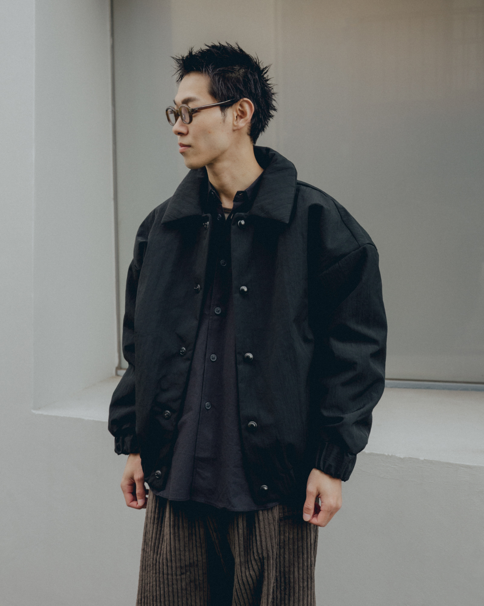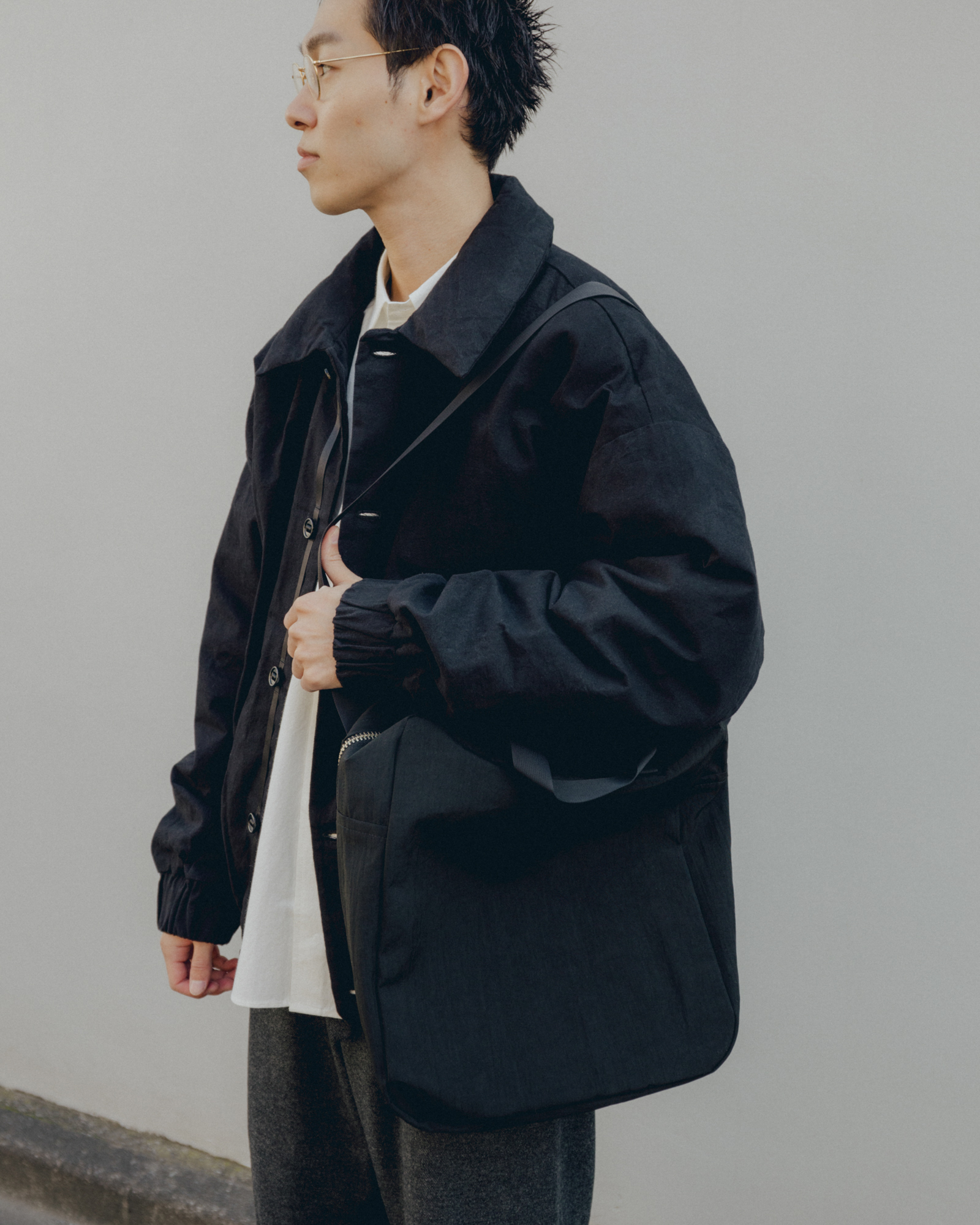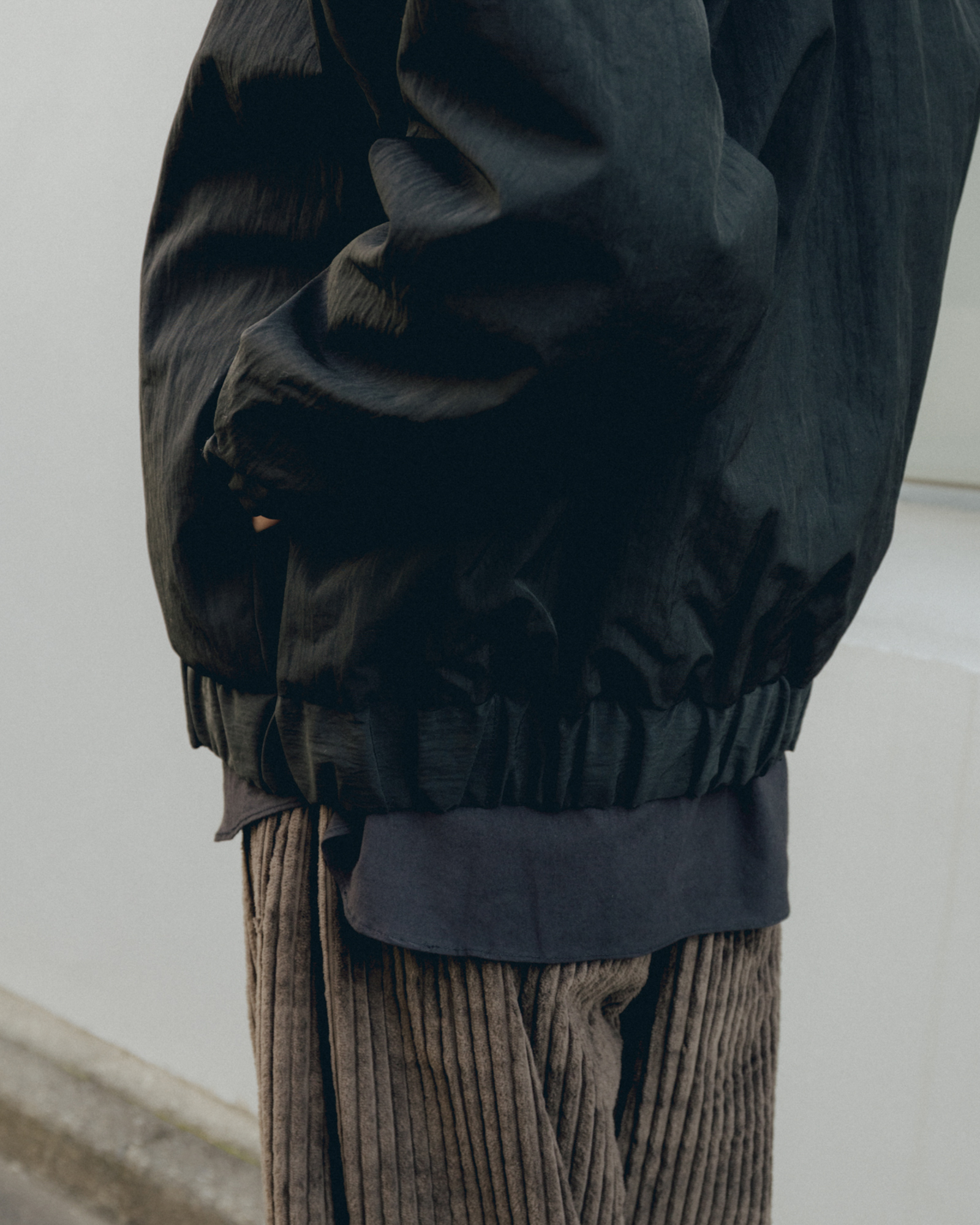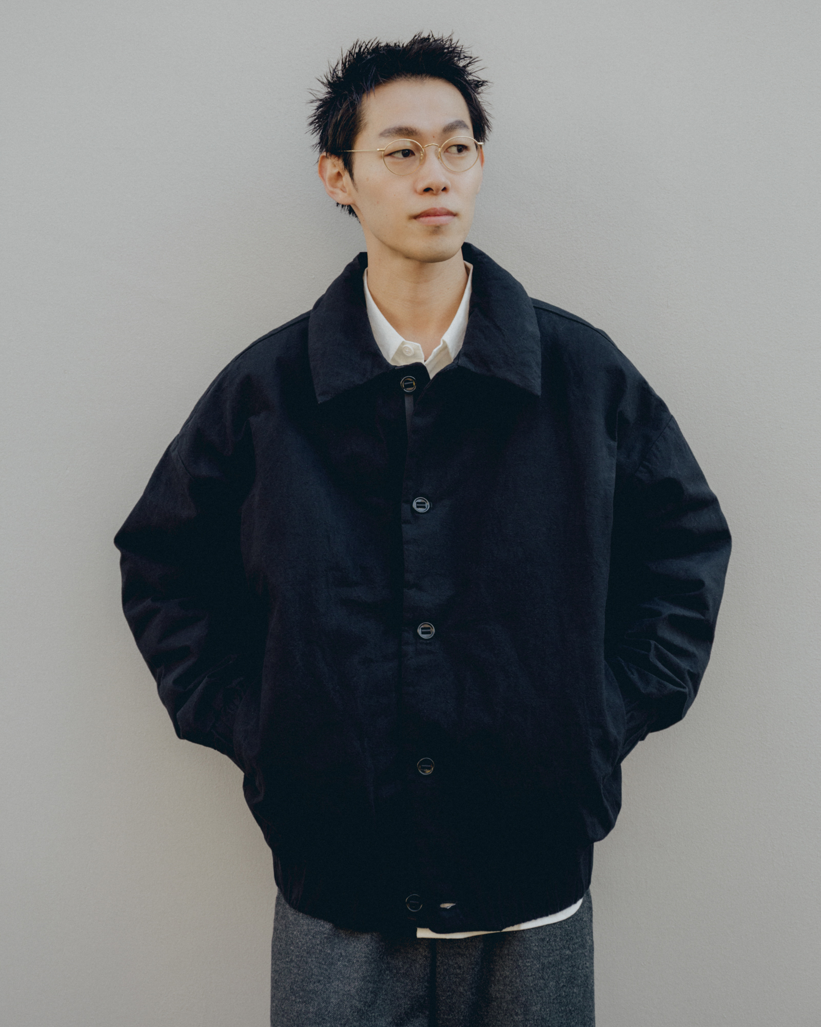 オーバーサイズシルエットのダウンブルゾン。ハンガリー産シルバーグースダウンを使用し、1891年創業の老舗羽毛専業メーカーである河田フェザー社で洗浄、加工されている。漂白剤を使用していないため、ダウン本来の斑模様が保たれている。その独特の風合いを引き立てるため、裏地には東レ開発の透明なナイロンマイクロリップストップを採用。ダウン90%・フェザー10%の比率でダマを防ぎ、超高品質に分類されるフィルパワー850を誇る。引くと外れるオリジナルのスナップ式のボタンが採用されている。通常、裏地やポケットは別生地が使用されるが、MAN-TLEの洋服はメインの生地を体感してほしいため、すべてが表地で構成される。