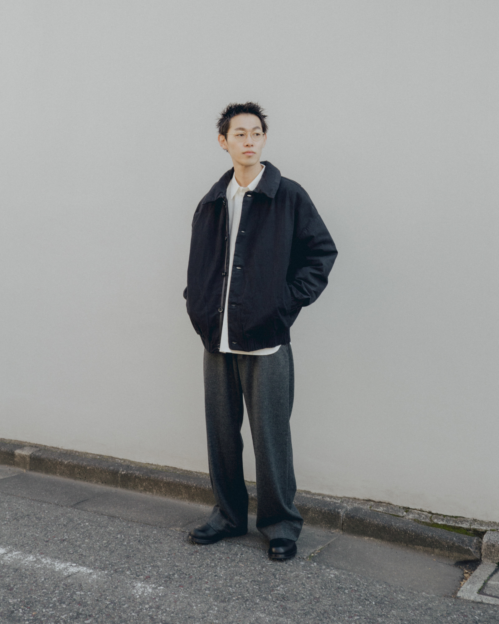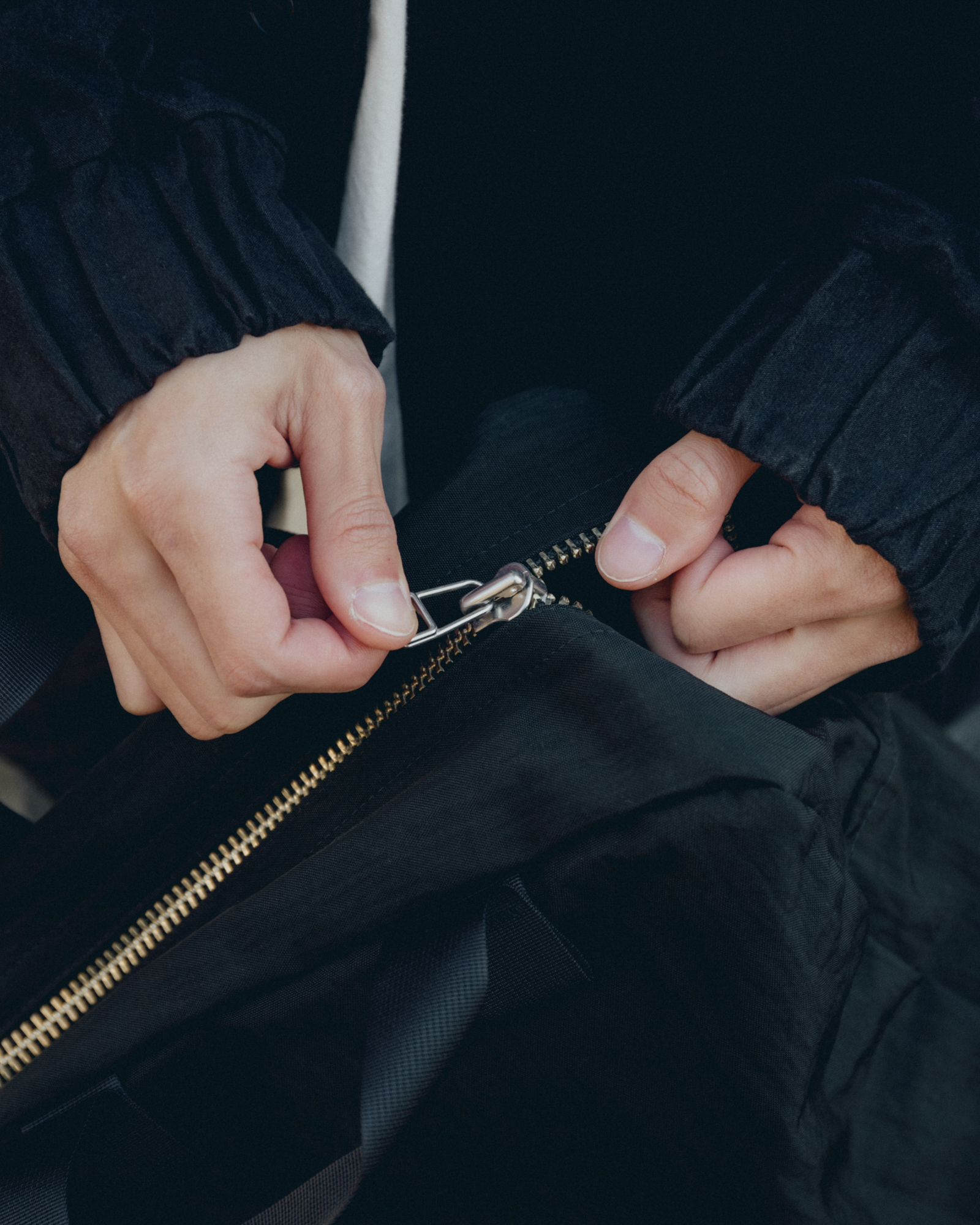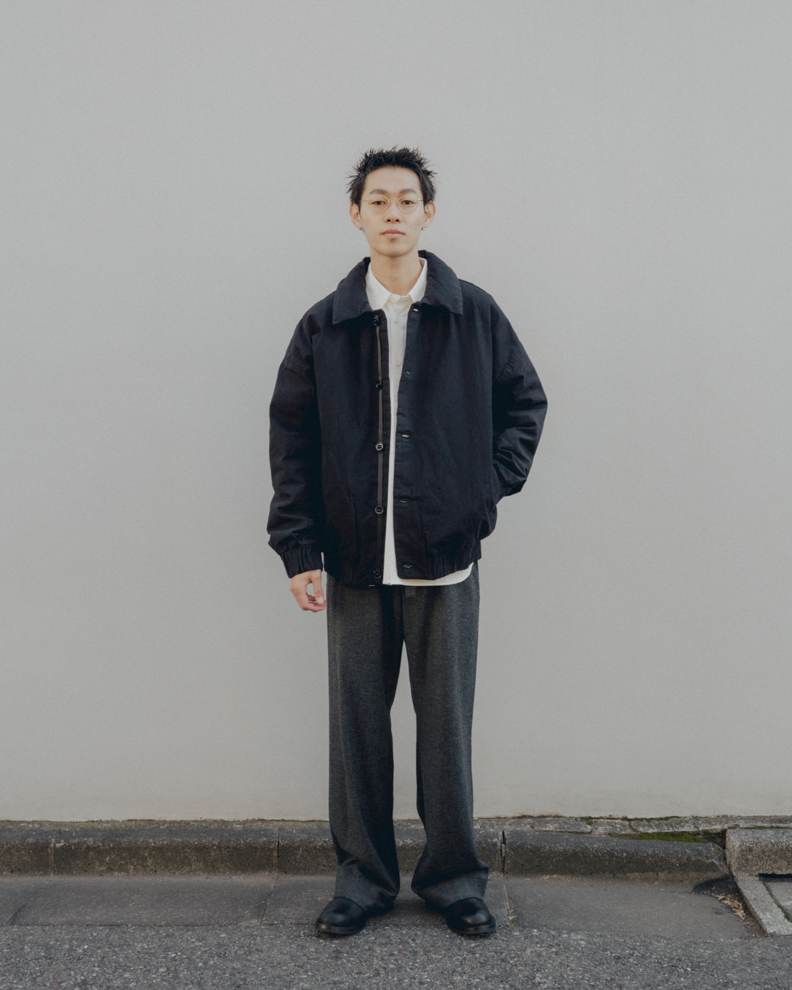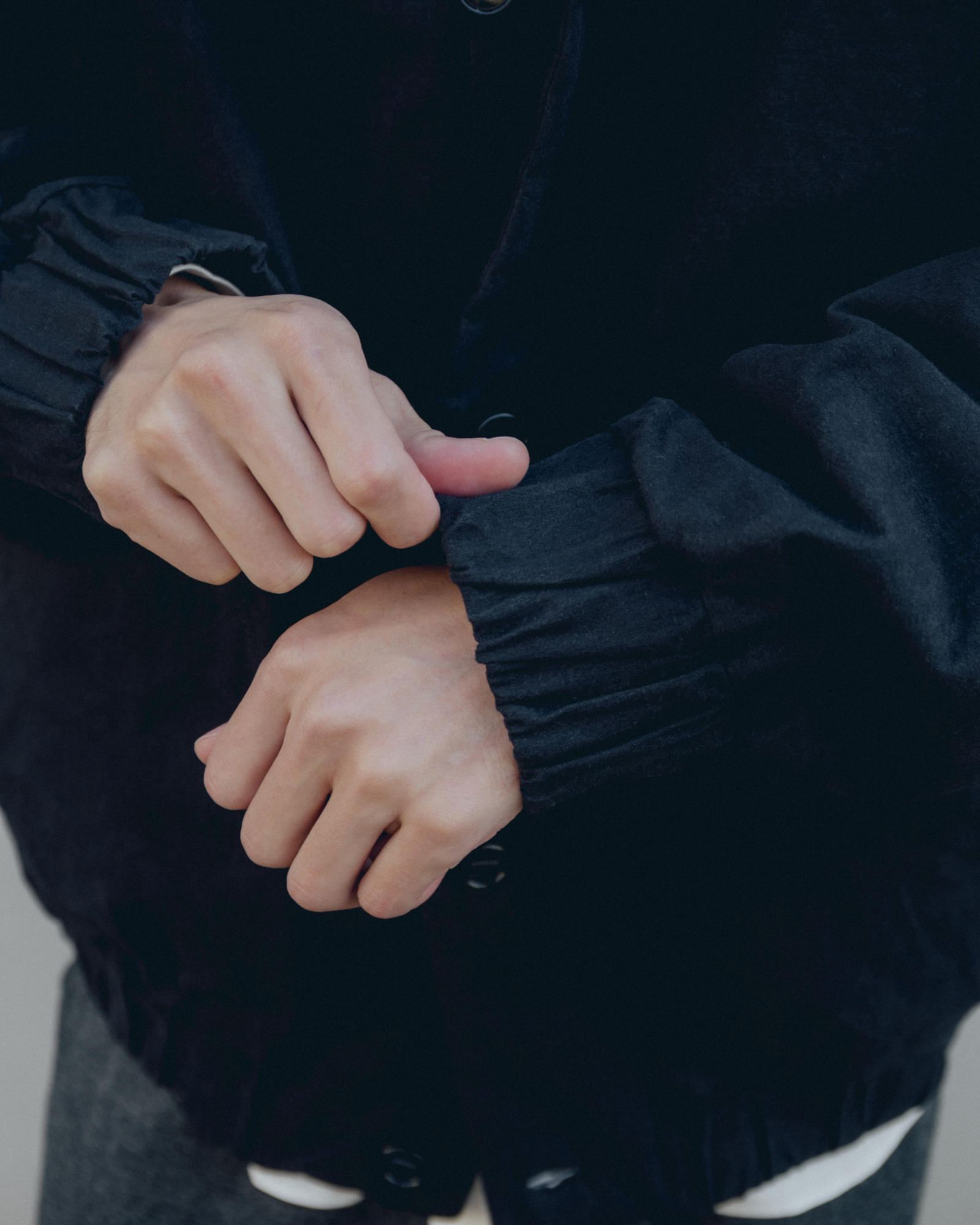 オーバーサイズシルエットのダウンブルゾン。ハンガリー産シルバーグースダウンを使用し、1891年創業の老舗羽毛専業メーカーである河田フェザー社で洗浄、加工されている。漂白剤を使用していないため、ダウン本来の斑模様が保たれている。その独特の風合いを引き立てるため、裏地には東レ開発の透明なナイロンマイクロリップストップを採用。ダウン90%・フェザー10%の比率でダマを防ぎ、超高品質に分類されるフィルパワー850を誇る。引くと外れるオリジナルのスナップ式のボタンが採用されている。通常、裏地やポケットは別生地が使用されるが、MAN-TLEの洋服はメインの生地を体感してほしいため、すべてが表地で構成される。