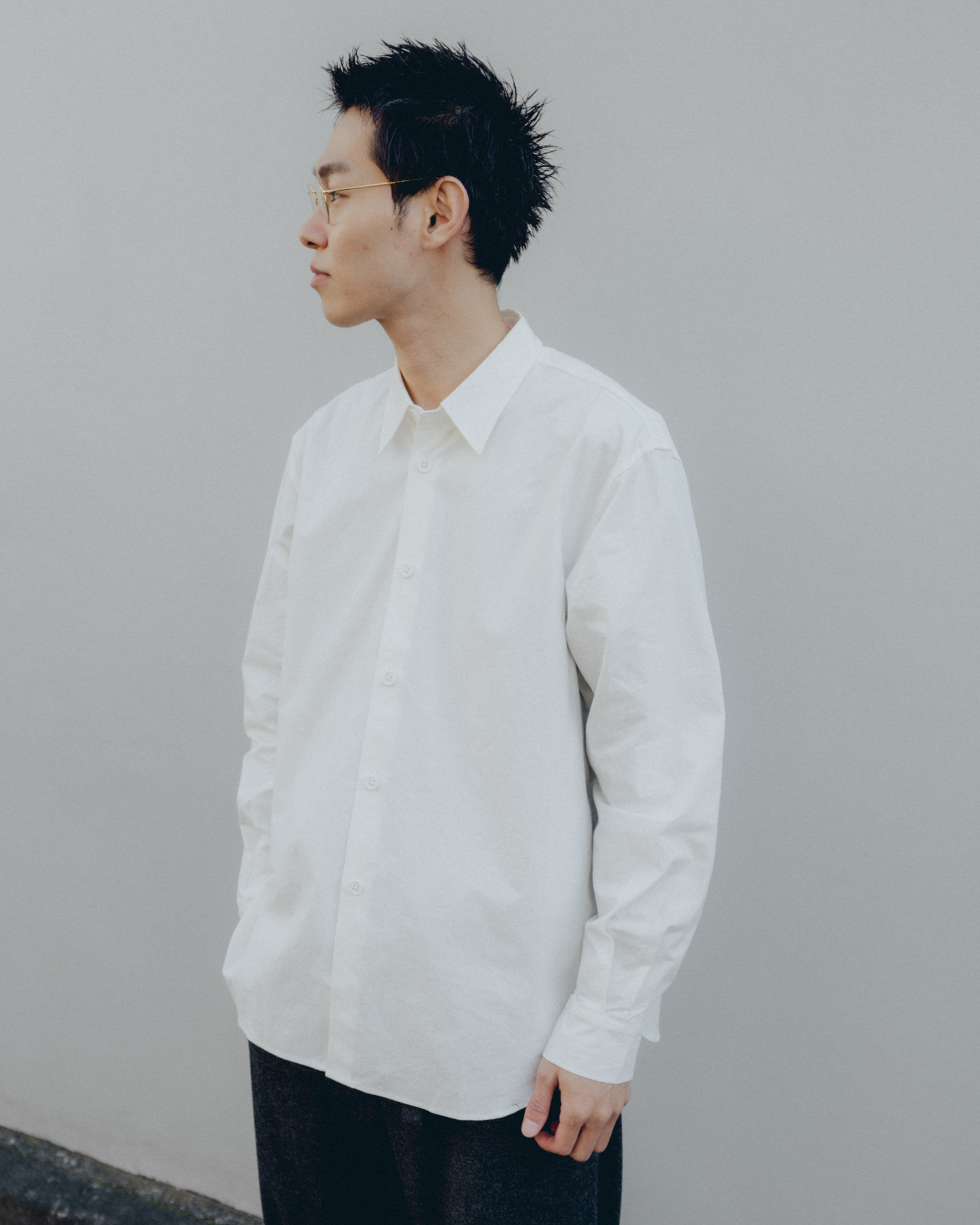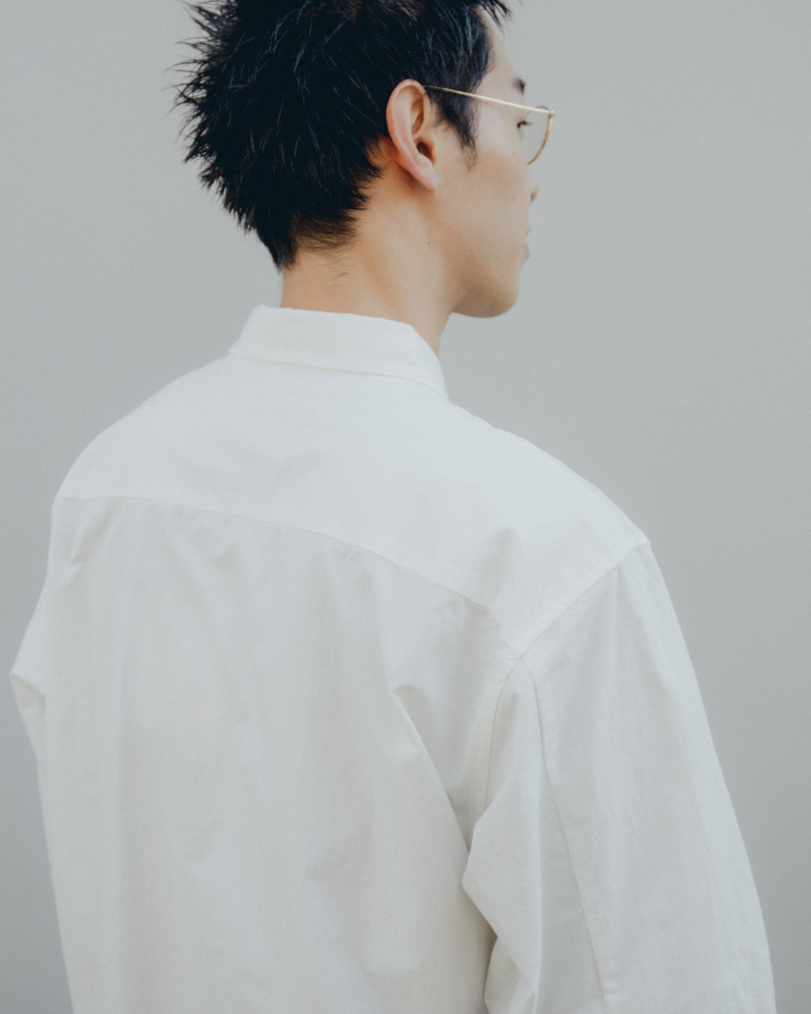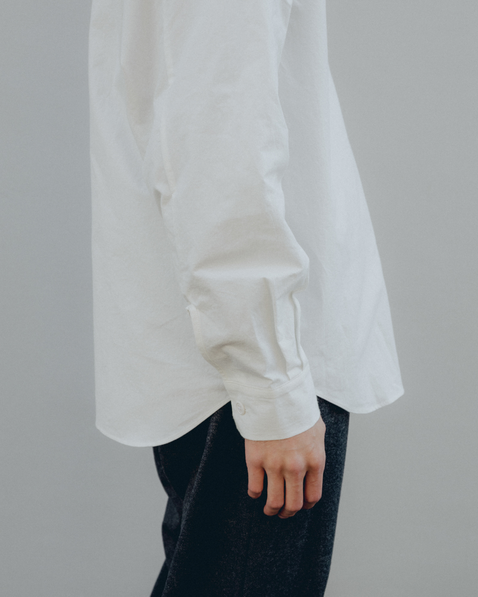 静岡県でつくられたオーバーサイズシルエットのシャツ。平織りの高密度の生地にウォッシュ加工を施している。洗濯と着用を繰り返すたびに風合いが変化し、より軽やかで紙のような質感へと変化していく。