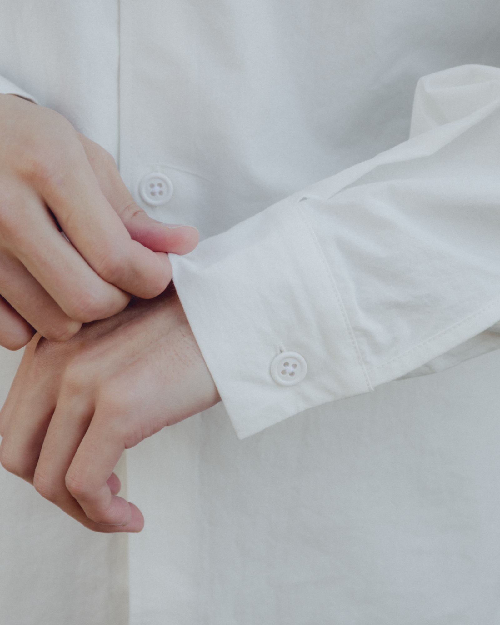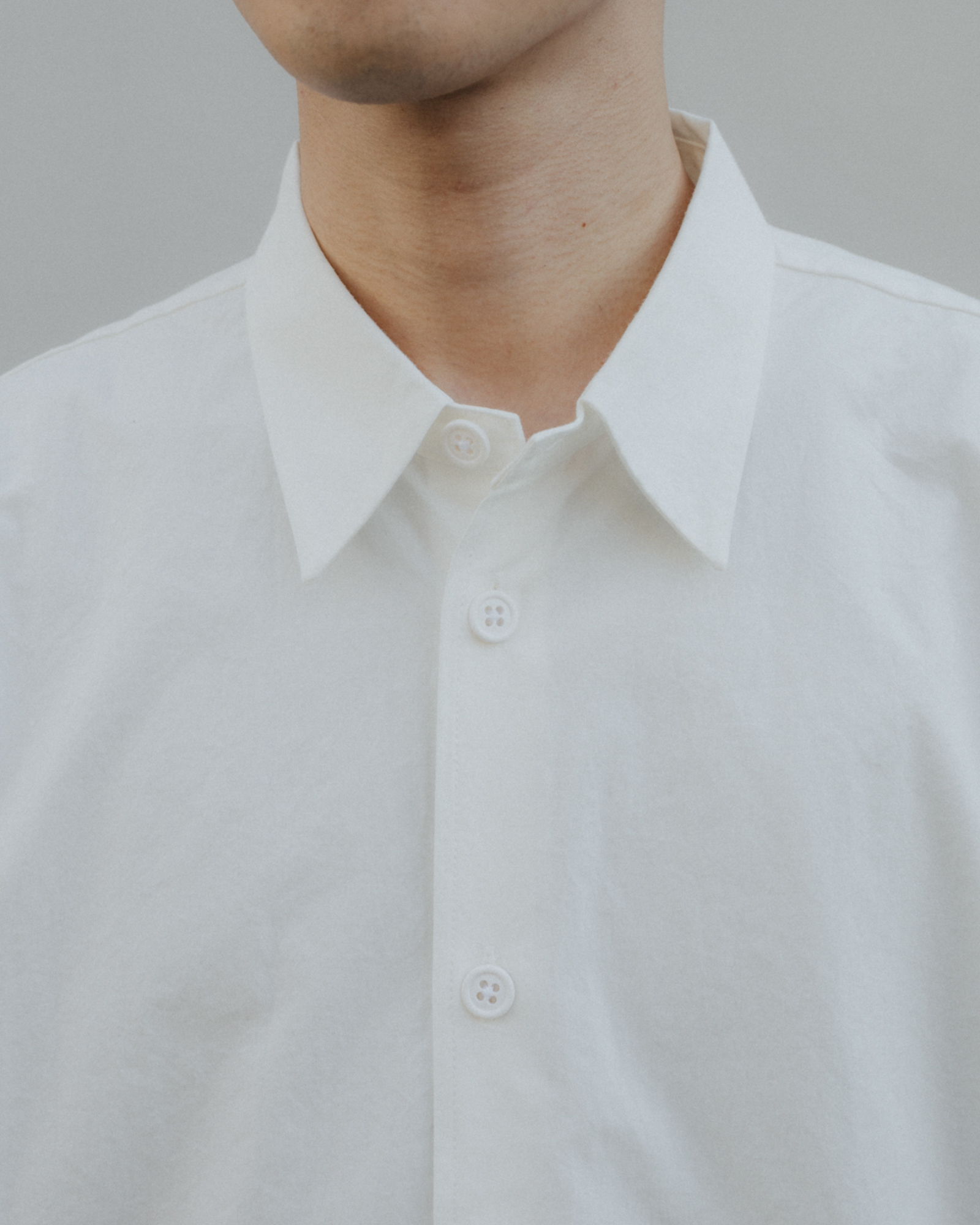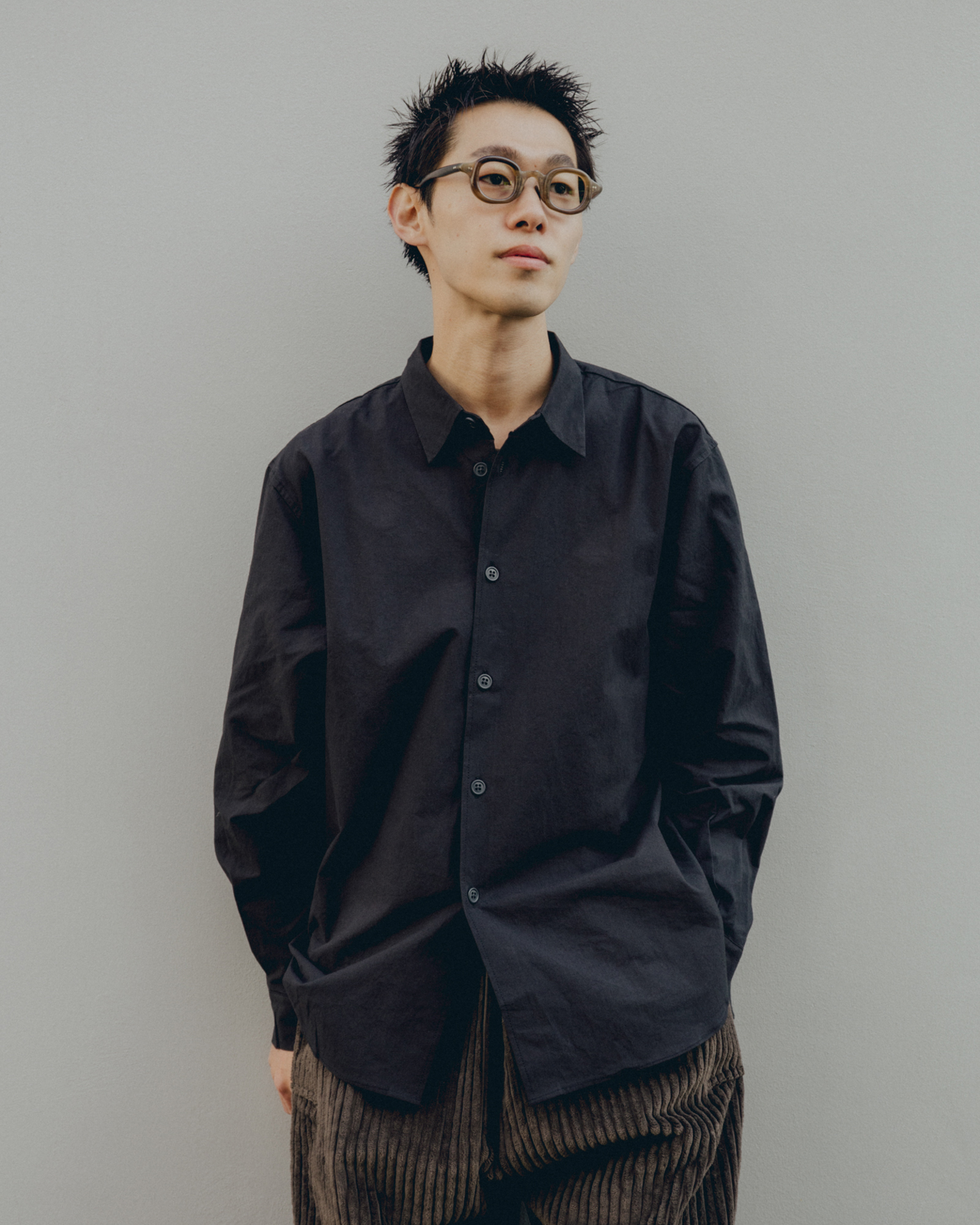 静岡県でつくられたオーバーサイズシルエットのシャツ。平織りの高密度の生地にウォッシュ加工を施している。洗濯と着用を繰り返すたびに風合いが変化し、より軽やかで紙のような質感へと変化していく。