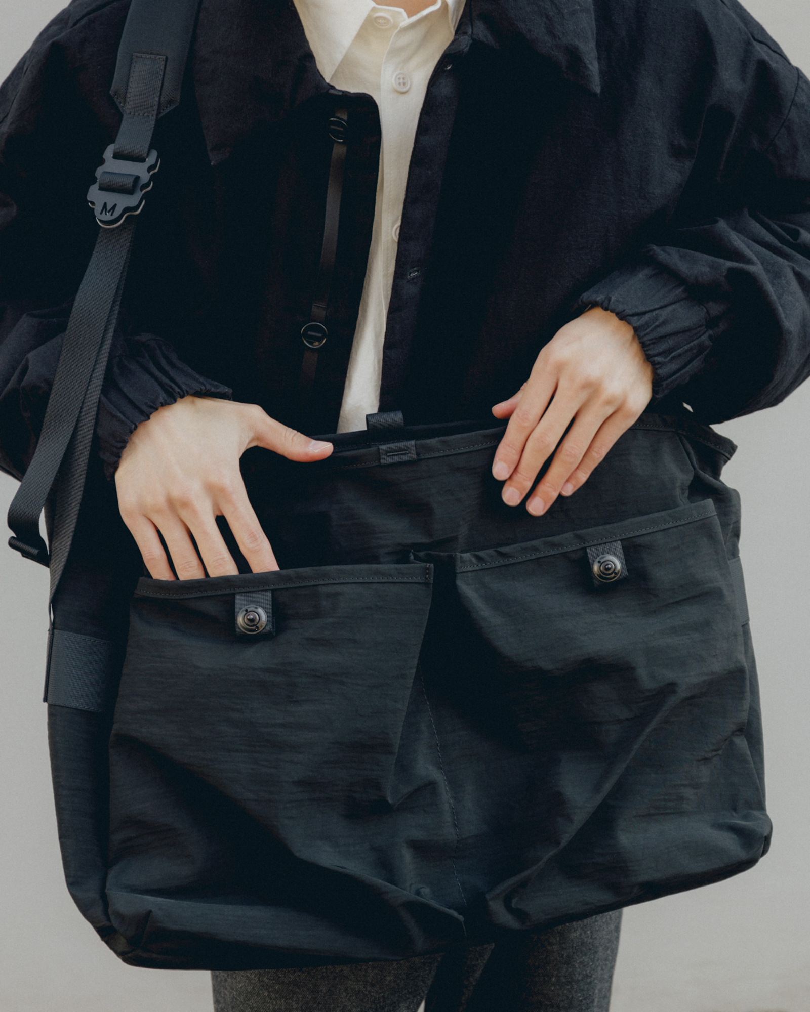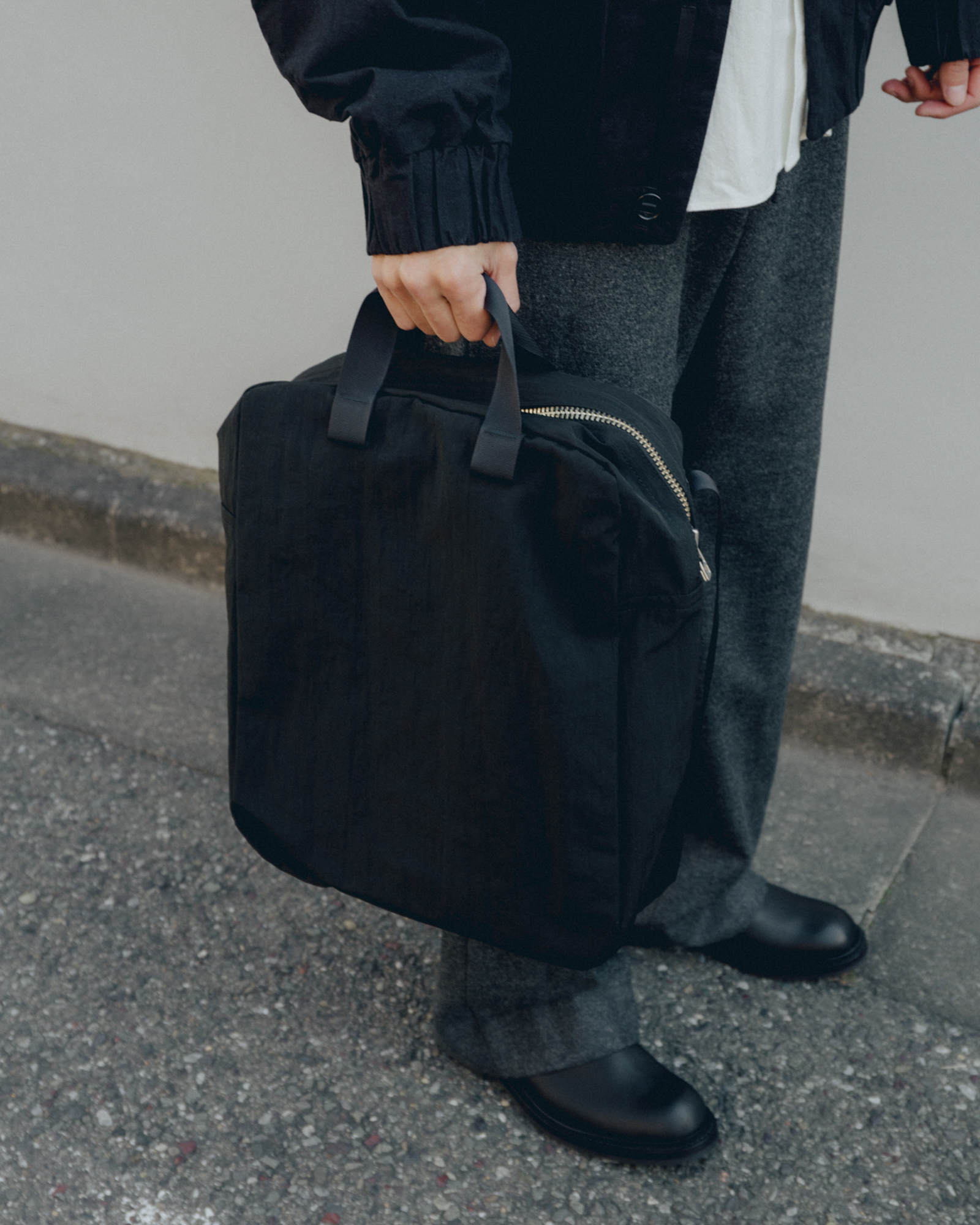 MAN–TLEオリジナルのナイロン生地を使用した定番のバッグ。ナイロンの平織りを塩化物処理で収縮させたもの。福井県の提携工場では、ナイロンでこのしわ加工を実現する独自手法を開発し、MAN-TLE専用に織り上げ、仕上げ加工を施している。この防水性がある素材は、湿気のある環境では柔らかく、乾燥状態では硬さを保つ。生地がギュッと密になり、厚み、ハリが生まれて強度が増す。元々スポーツカーの屋根を固定するためにコーティングされた真鍮製。