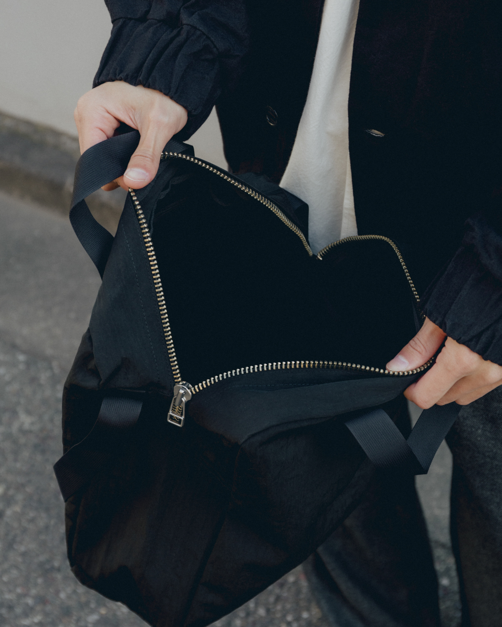 YKKファスナーを使用したマルチハンドルトート。クロスボディで着用可能なロングショルダーストラップ付き。