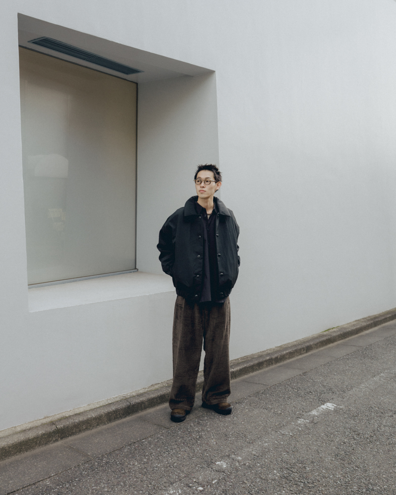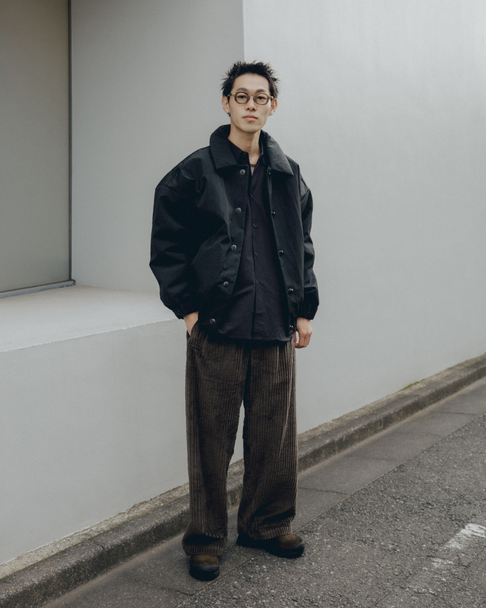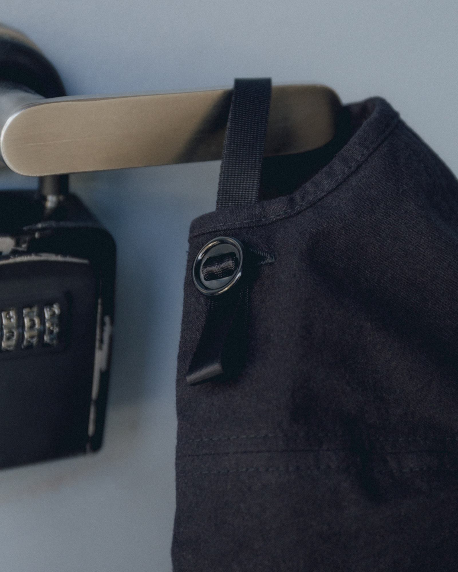 同型のBLACK WAX素材。綿にワックスの一種であるパラフィンコーティング加工をすることにより、撥水性、防風性が備わり経年変化が楽しめることはもちろん、生地が硬くなり、動きやシワの表情を演出している。シートベルトに使われる素材とボタンを組み合わせたギミックは着脱を繰り返すうちに糸がほどけ、ボタンが取れないように考えられている。秀逸なデザインとしても力を発揮している。始めこそゴワゴワと固い生地ではあるが、そこがこの服の狙い。着る人の形に沿って記憶が服に宿っていくように育っていく。洗うたびに風合いが出て、時の経過とともにテクスチャーの変化を楽しむことができる定番の一着。