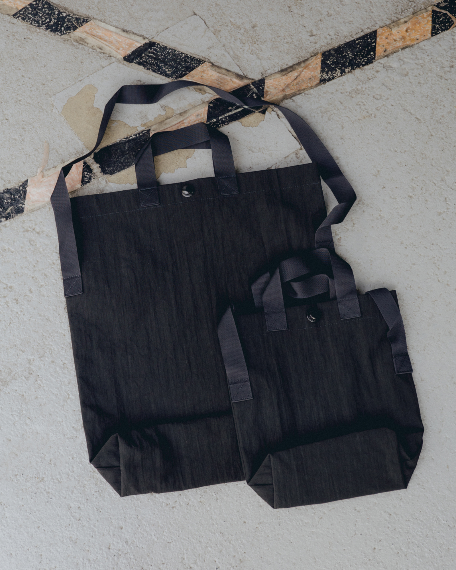 MINI TOTEはMULTI HANDLE TOTEのハーフサイズバージョン。スナップボタン付きの折りたたみ式ミニトート。短いハンドル2本と、クロスボディで着用可能な長いショルダーストラップが付属する。