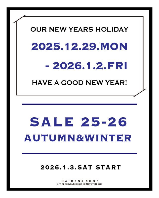 【AUTUMN/WINTER SALE 2025-26】 【年末年始 営業日程のお知らせ】 【MAIDENS SHOP POP-UP AT COLBO, NYC|2025 EVENT DIARY】 【COMOLI】”AW25 COLLECTION” -11th DELIVERY- 【MAN-TLE】”R19 COLLECTION” 【Lesca LUNETIER TRUNK SHOW】 【RICHARD MASCIANTONIO】-NEW BRAND FOR USA- 【GLENMAC】”THE BEST QUALITY KNITWEAR” 【COMOLI】”AW25 COLLECTION” -9th DELIVERY- 【BLACKBIRD SPYPLANE ×TARVAS】 ”WANDERER” 2025.11.10 (mon) Release 【evan kinori × LADY WHITE CO. × MAIDENS SHOP】10th CAPSULE COLLECTION ITEMS 【evan kinori】-new editions for autumn & winter- 【evan kinori】“10 years of making / POP-UP at MAIDENS SHOP in Tokyo” 【LEA BOBERG MADE-TO-ORDER EVENT 2025】 【RECRUIT|採用情報】 “Bergfabel” from ITALY -AUTUMN/WINTER 2025- 【FilMelange × MAIDENS SHOP】 ”DENES” 【Sillage × Settlemier’s for MAIDENS SHOP 10th Anniversary】2025. 10.11 (sat) Release. 【ANSNAM CUSTOM ORDER EXHIBITION】 【Lea Boberg】AUTUMN / WINTER 20252025.9.20 (sat) Release