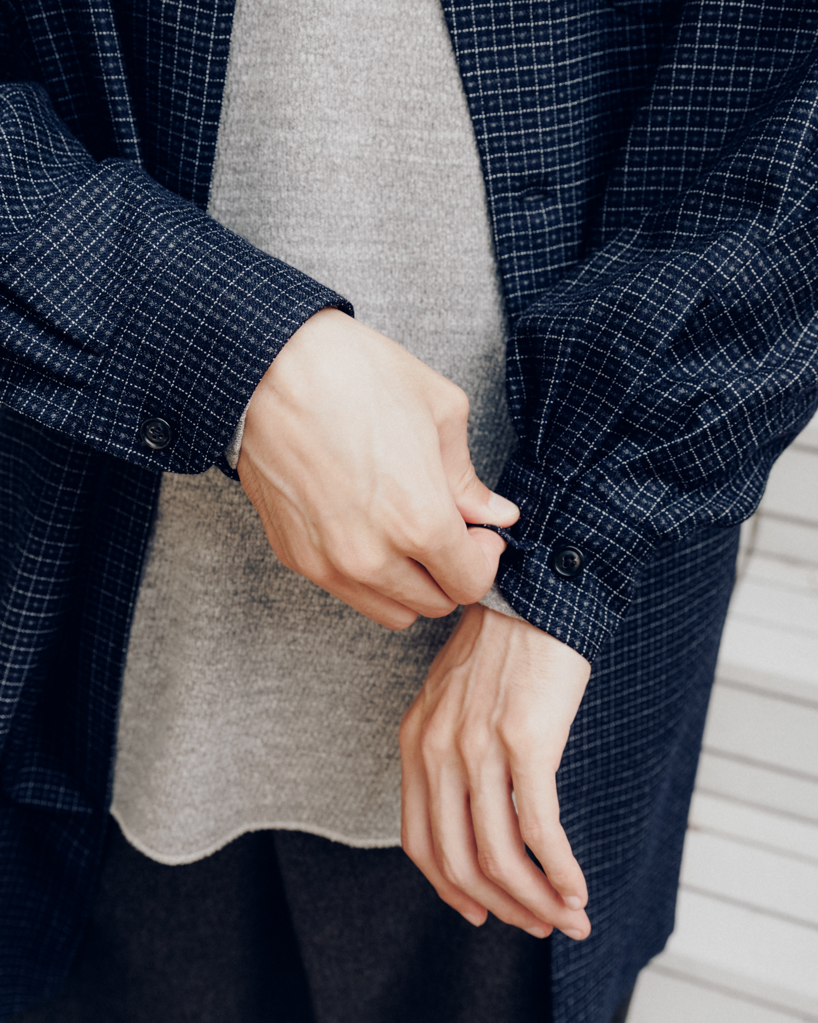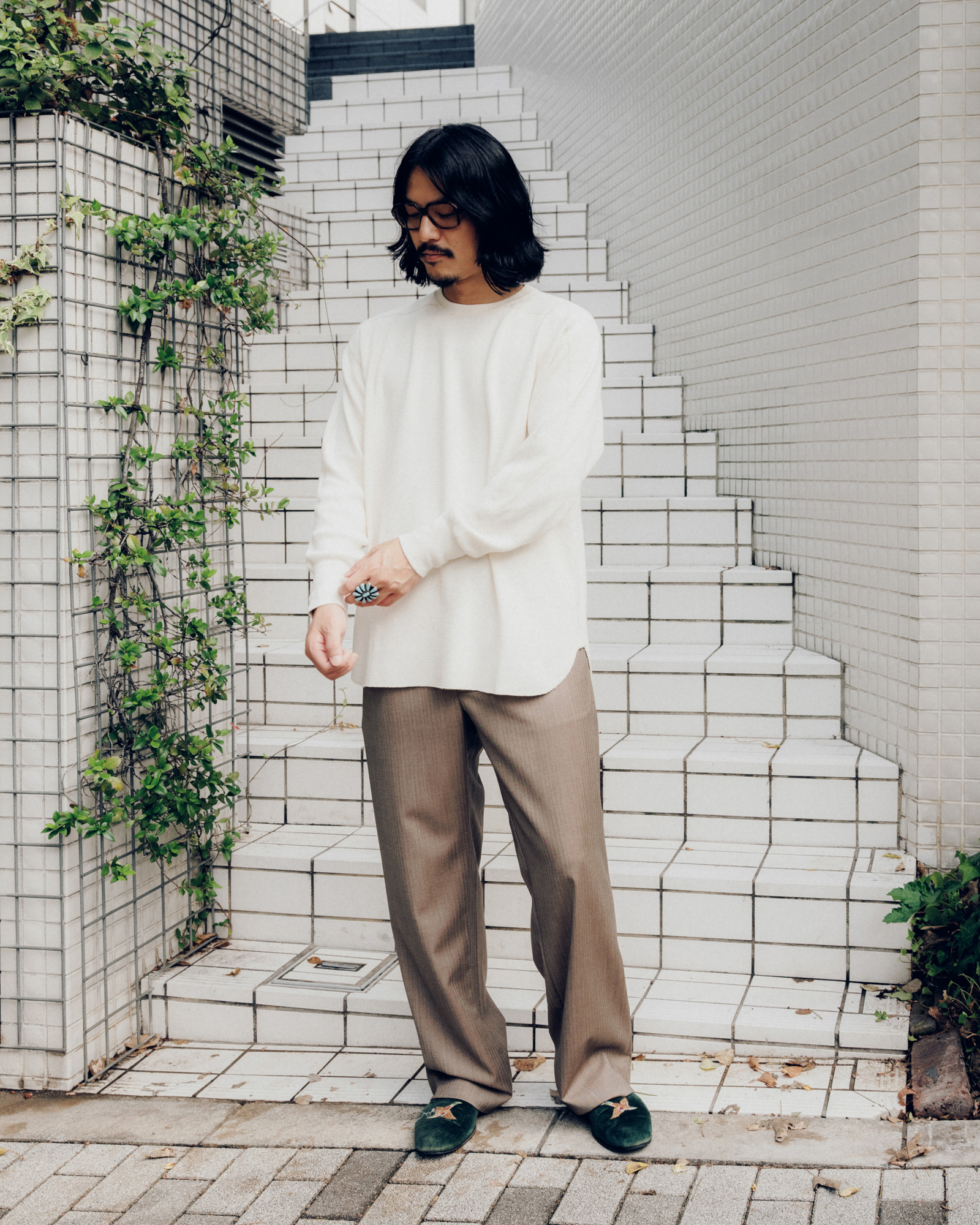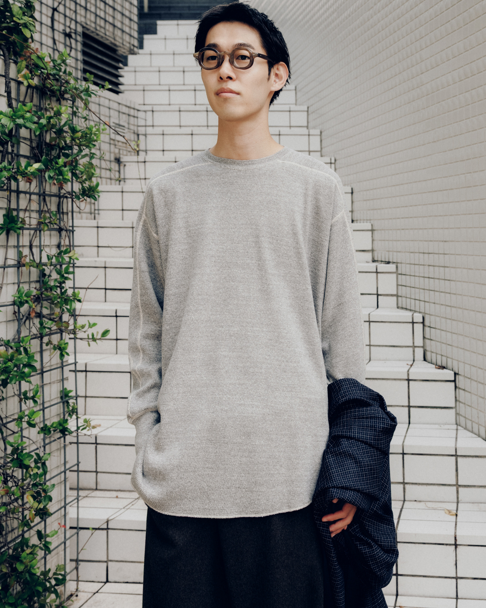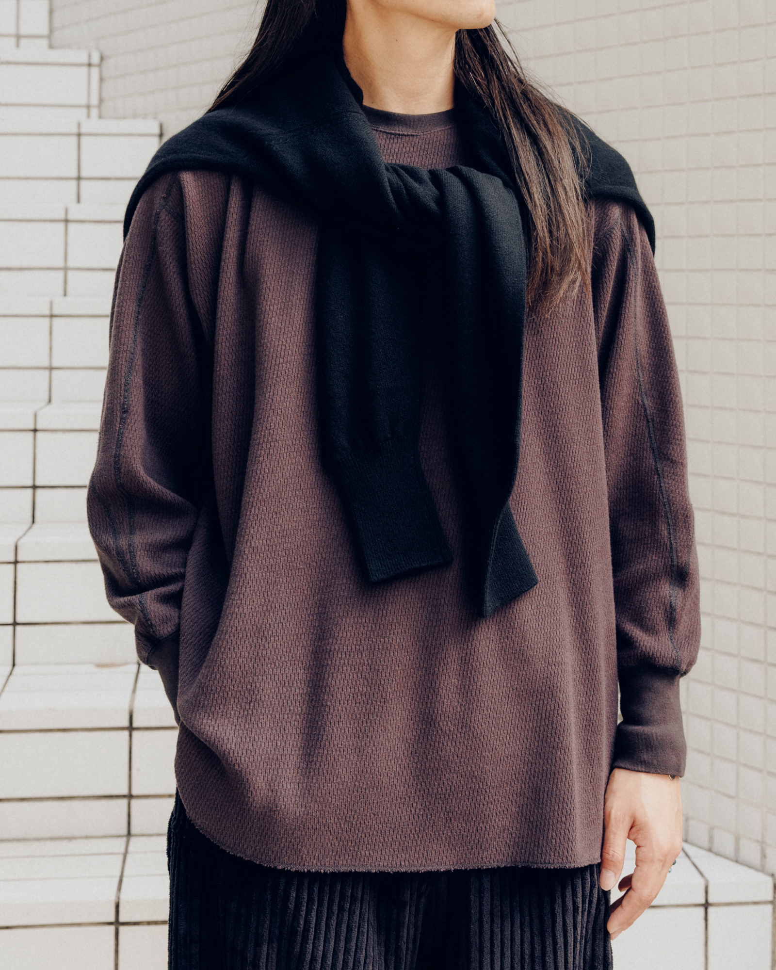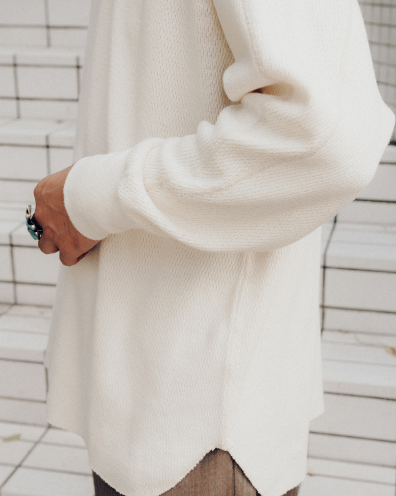 あとはスタイリングですね。単にインナーウェアではなく、テールカットになっておりレイヤードする時に裾が良い感じに出るので、そこを活かしたコーディネートも出来るんです。
