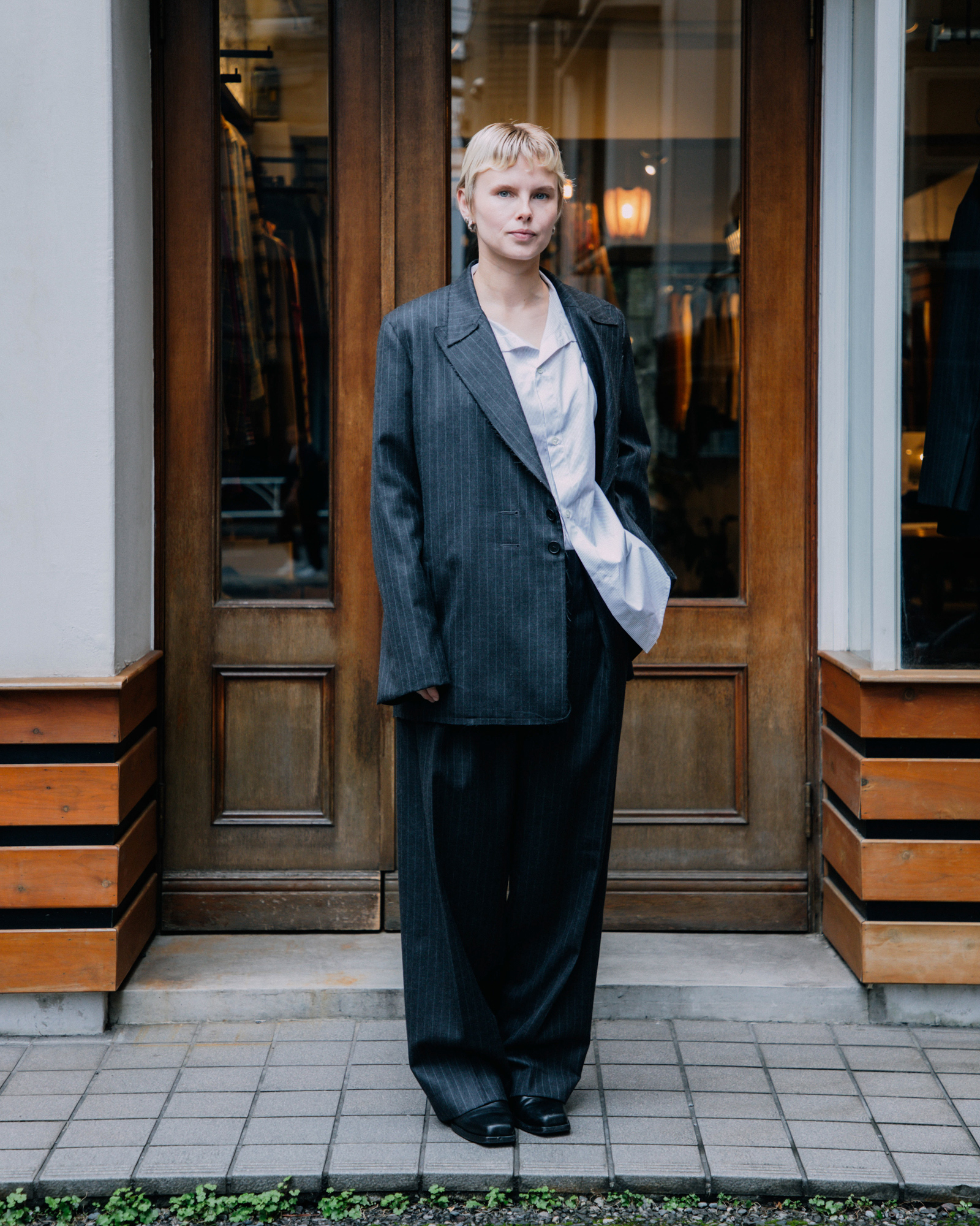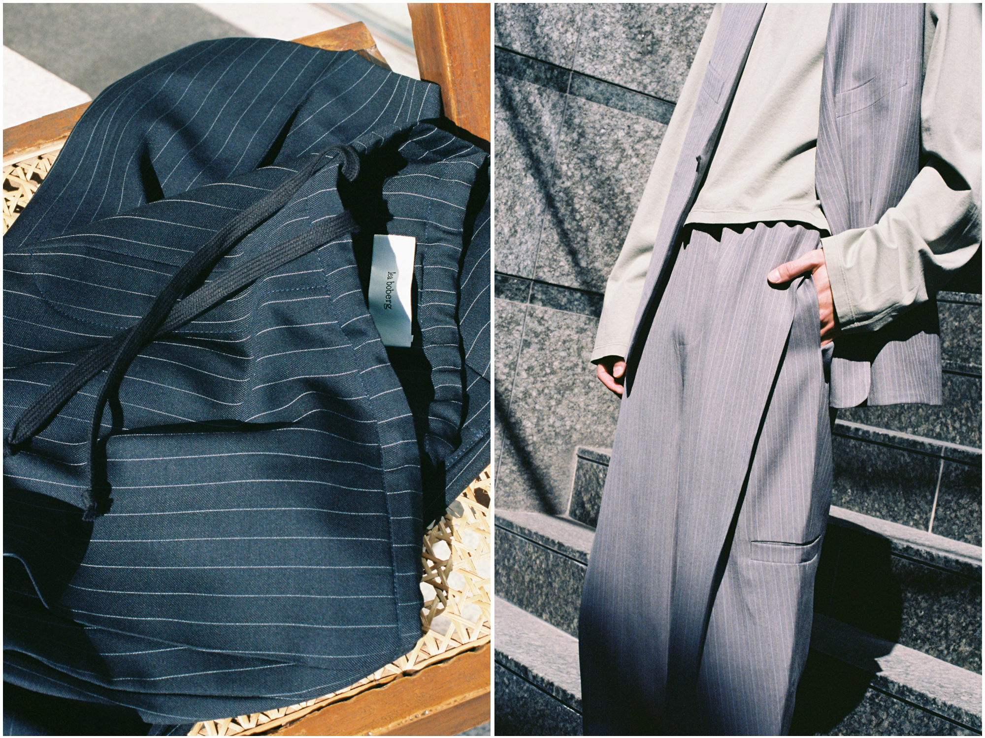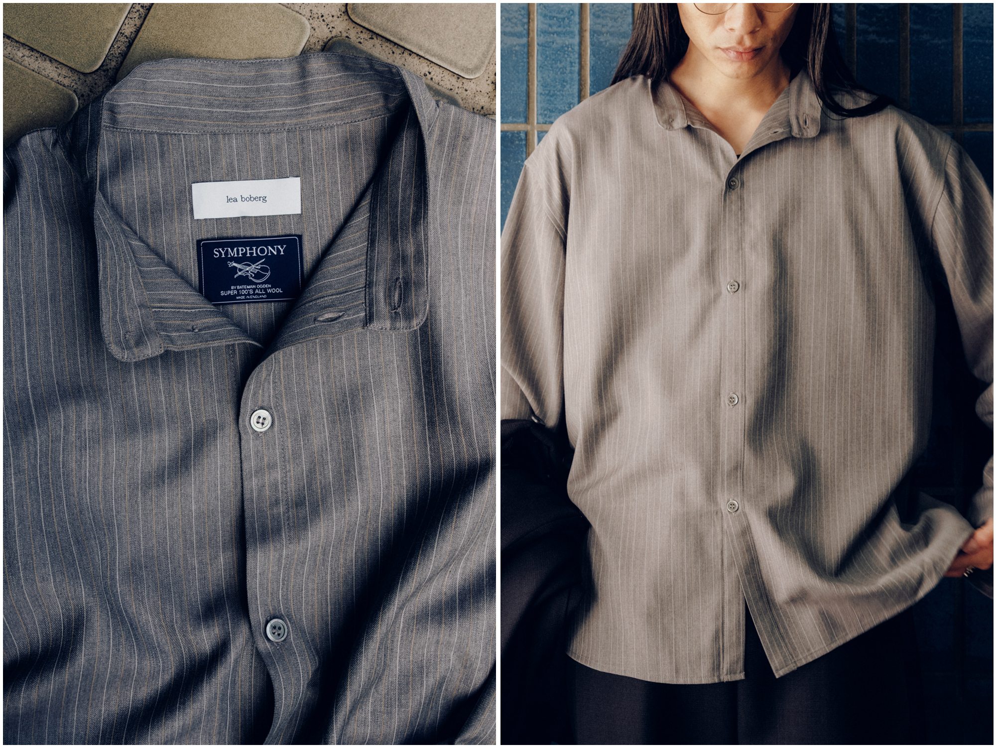 座ったときにパンツの裾から足首が見える瞬間や、コーヒーカップを手にしたときにジャケットの袖口から手首が現れる場面など、日常のさりげない瞬間にまで意識が向けられており、これらの細部への配慮こそが、Leaのアプローチの核となっている。
