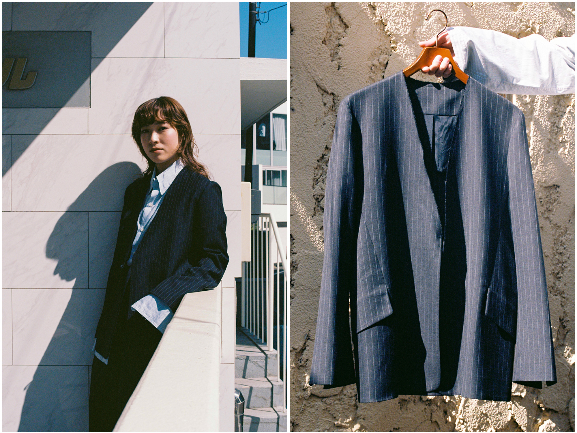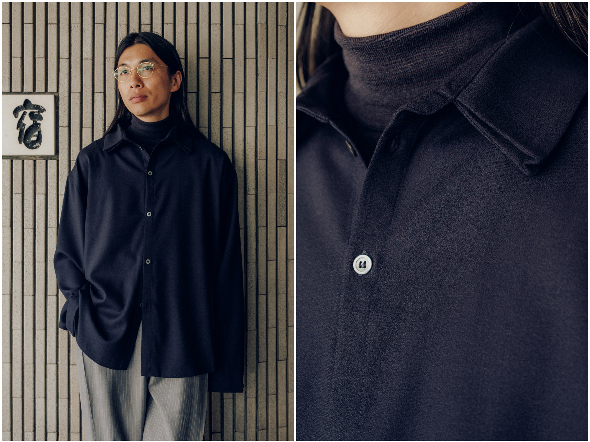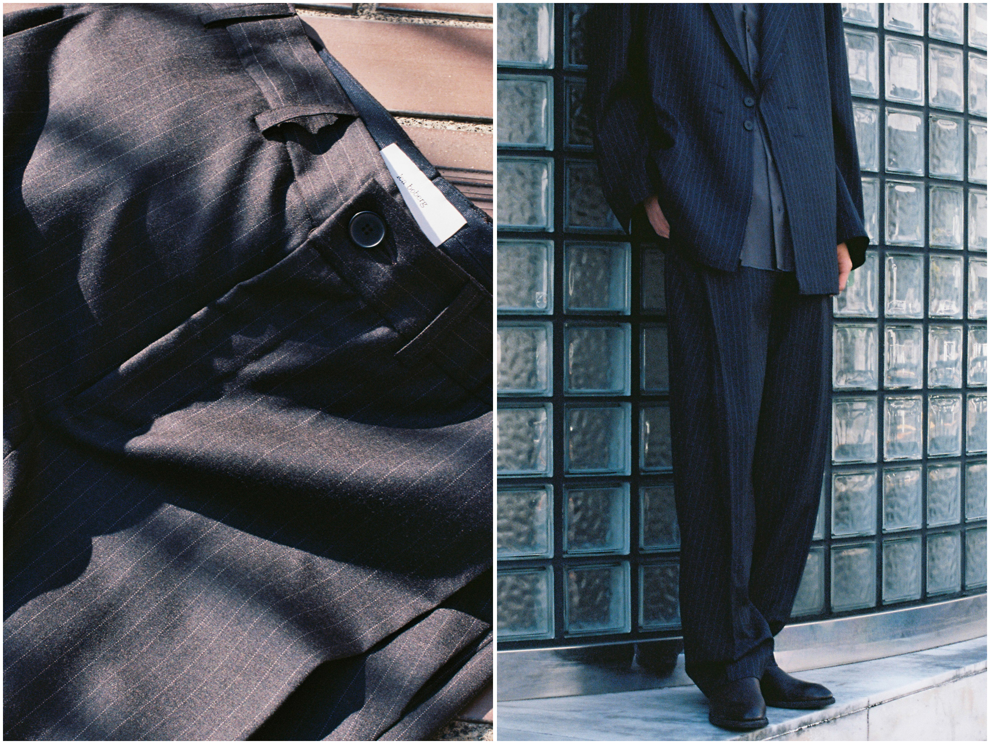 座ったときにパンツの裾から足首が見える瞬間や、コーヒーカップを手にしたときにジャケットの袖口から手首が現れる場面など、日常のさりげない瞬間にまで意識が向けられており、これらの細部への配慮こそが、Leaのアプローチの核となっている。